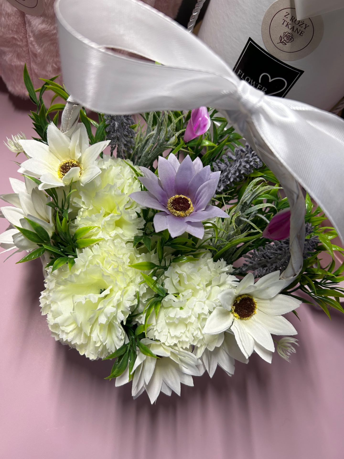 Delikatność, romantyzm i świeżość w jednym. Koszyk Letnich Marzeń to ręcznie wykonana dekoracja z wysokiej jakości sztucznych kwiatów: kremowych goździków, białych margaretek, pastelowych akcentów oraz fioletowych wrzosów. Całość została osadzona w eleganckim, białym koszyku i zwieńczona dużą, satynową kokardą.