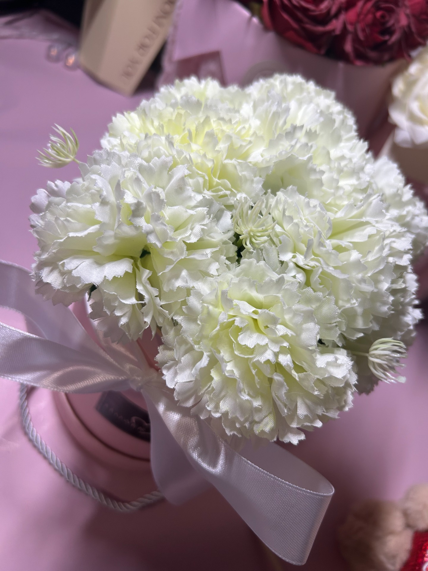 Delikatna i pełna uroku kompozycja, która przemawia ciszą i sercem. Miłosny Dotyk to połączenie kremowych, sztucznych goździków z eleganckim pudełkiem ozdobionym szeroką, białą wstążką.