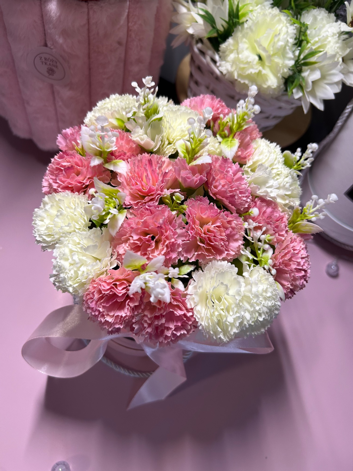 Delikatna kompozycja w odcieniach pudrowego różu i kremowej bieli – stworzona, by zachwycać swoją świeżością i subtelnym urokiem. To idealny wybór na prezent dla bliskiej osoby, dekorację stołu lub sposób na odrobinę codziennej przyjemności.