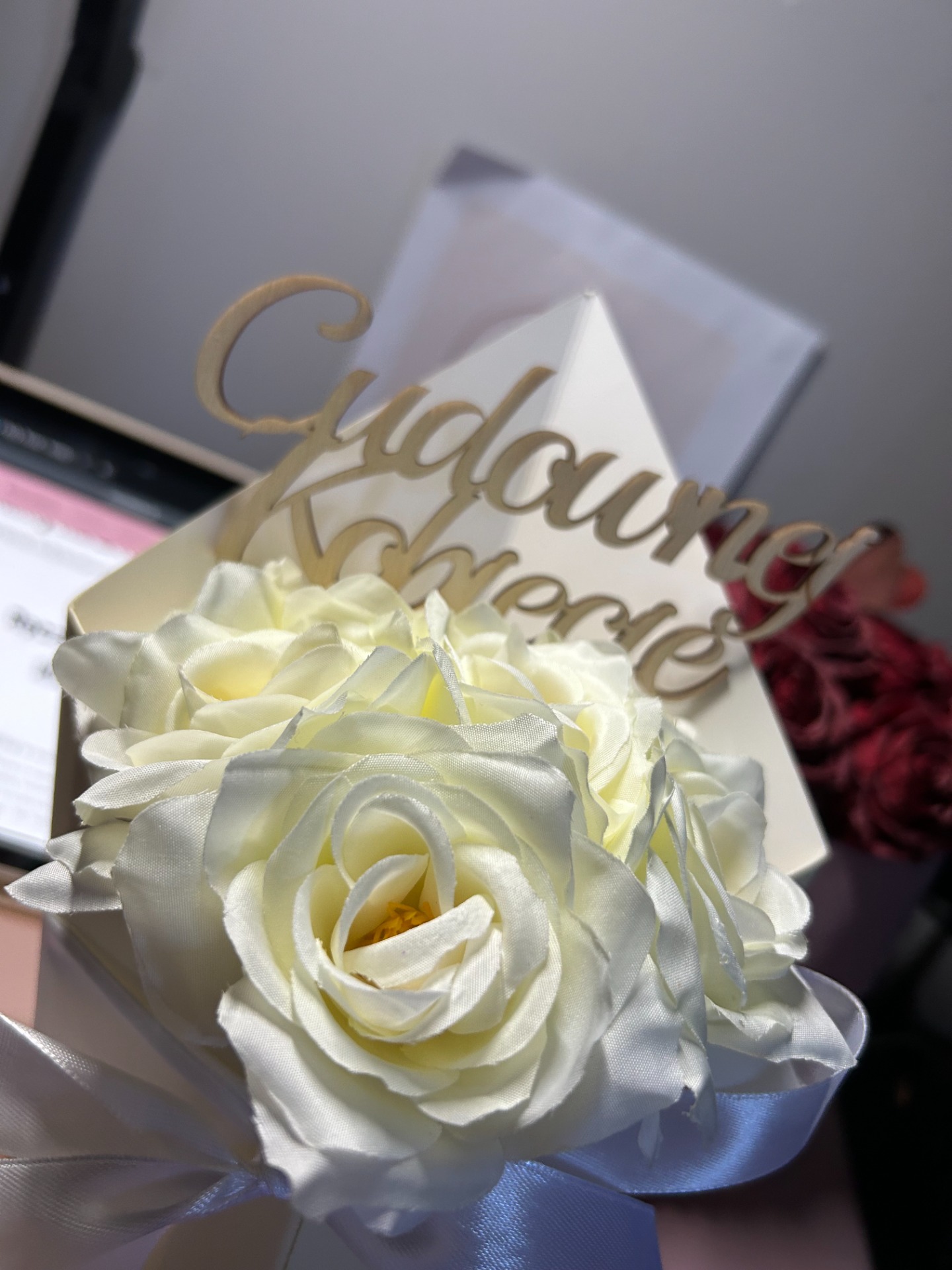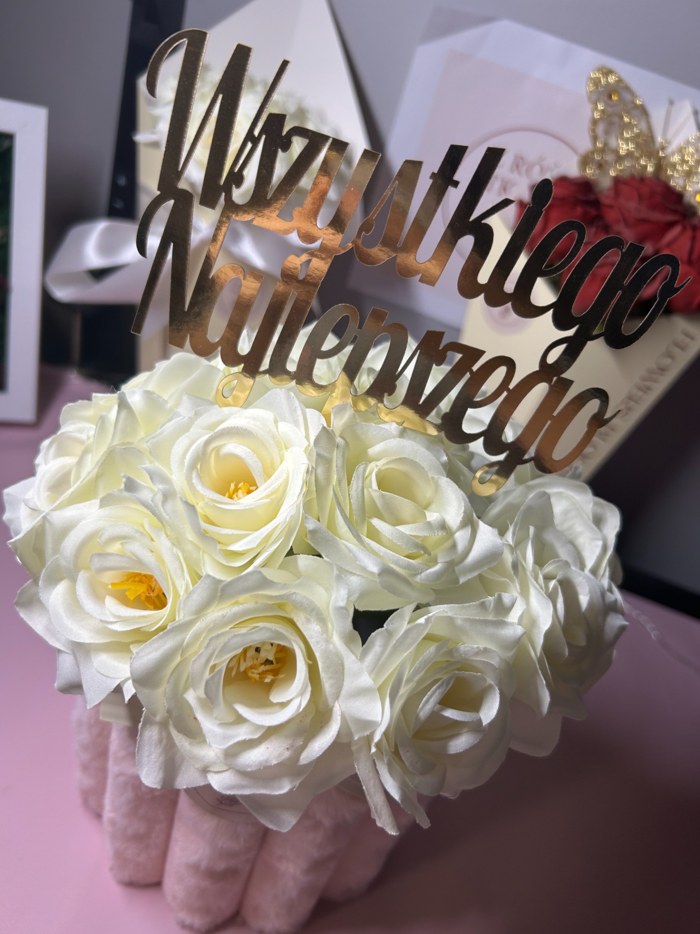 Otulony miękkim, pluszowym materiałem w odcieniu pudrowego różu, ten elegancki koszyczek kryje w sobie kompozycję kremowych róż, które nigdy nie zwiędną. Idealny jako prezent dla kogoś bliskiego – lub po prostu dla siebie. Każdy egzemplarz powstaje ręcznie z dbałością o najdrobniejszy detal. To połączenie estetyki, trwałości i subtelnego uroku.