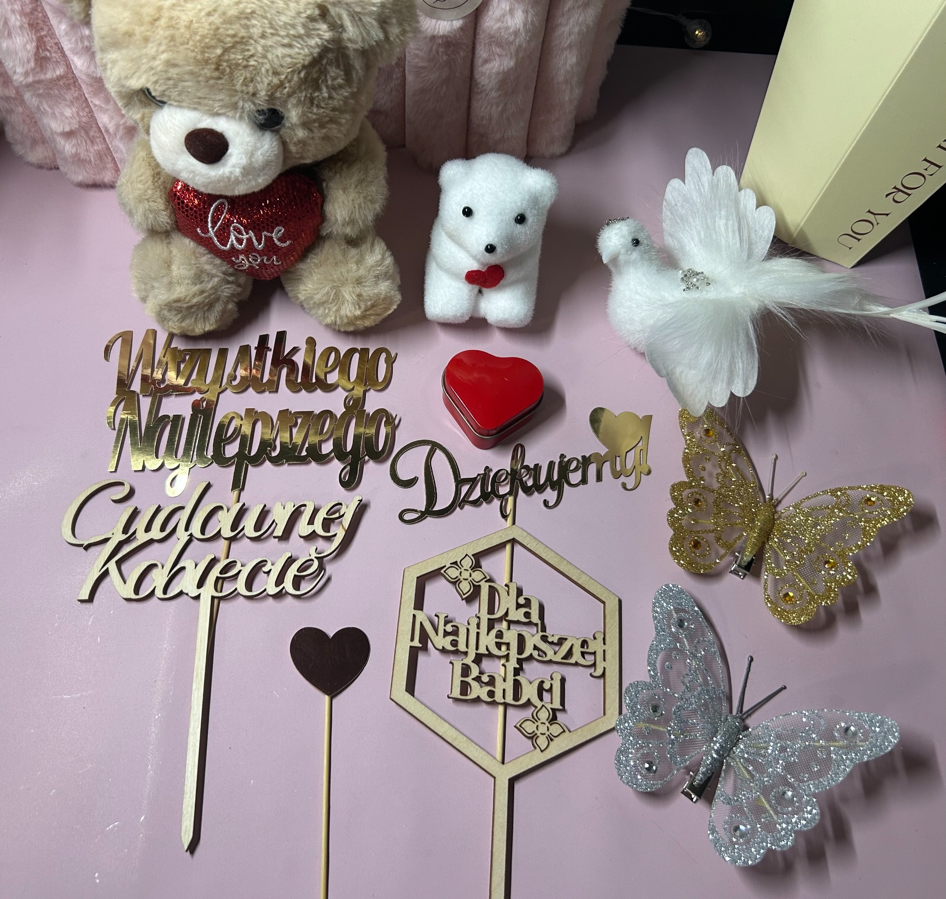 Możliwość dodania dekoracji widocznych na ostatnim zdjęciu. Przy zamawianiu w miejscu podania paczkomatu, proszę o dopisanie, którą dekorację dodać.